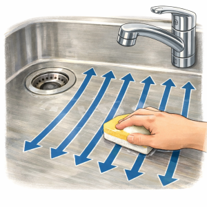 水垢・石けんカス・油汚れは、それぞれ性質が違うため、汚れに合った洗剤選びと、ステンレスの筋に沿った正しいこすり方がとても重要になります。